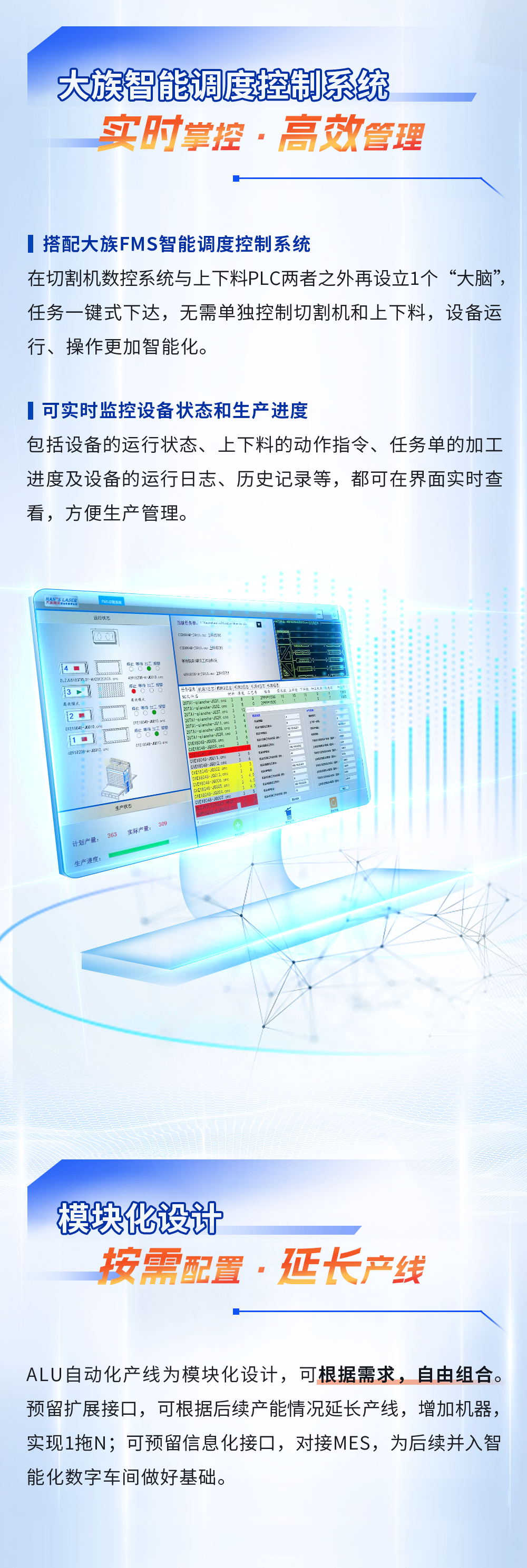 全新结构的ALU系列自动化切割生产线,协调性更高、效率更高,模块化设计,可根据需求自由组合,预留扩展接口,可根据后续实际产能情况增加机器,实现1拖N,并可预留信息化接口,对接MES,为后续并入智能化数字车间做好基础。